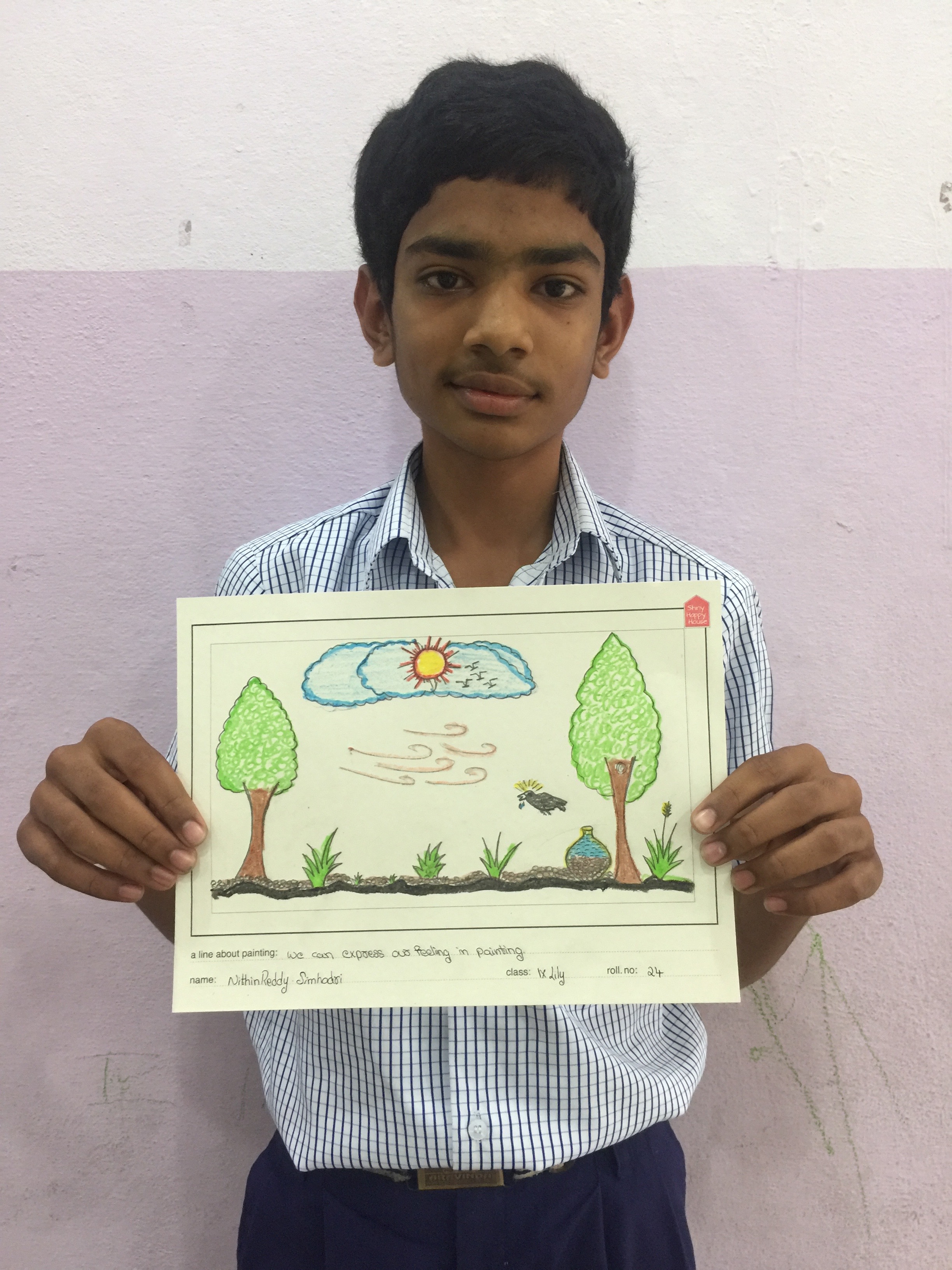 As a prelude, our team asked the students class wise from 3rd to 9th to make pictorial drawings of a story which was made common to all. The suggested story was the popular one `Thirsty crow’