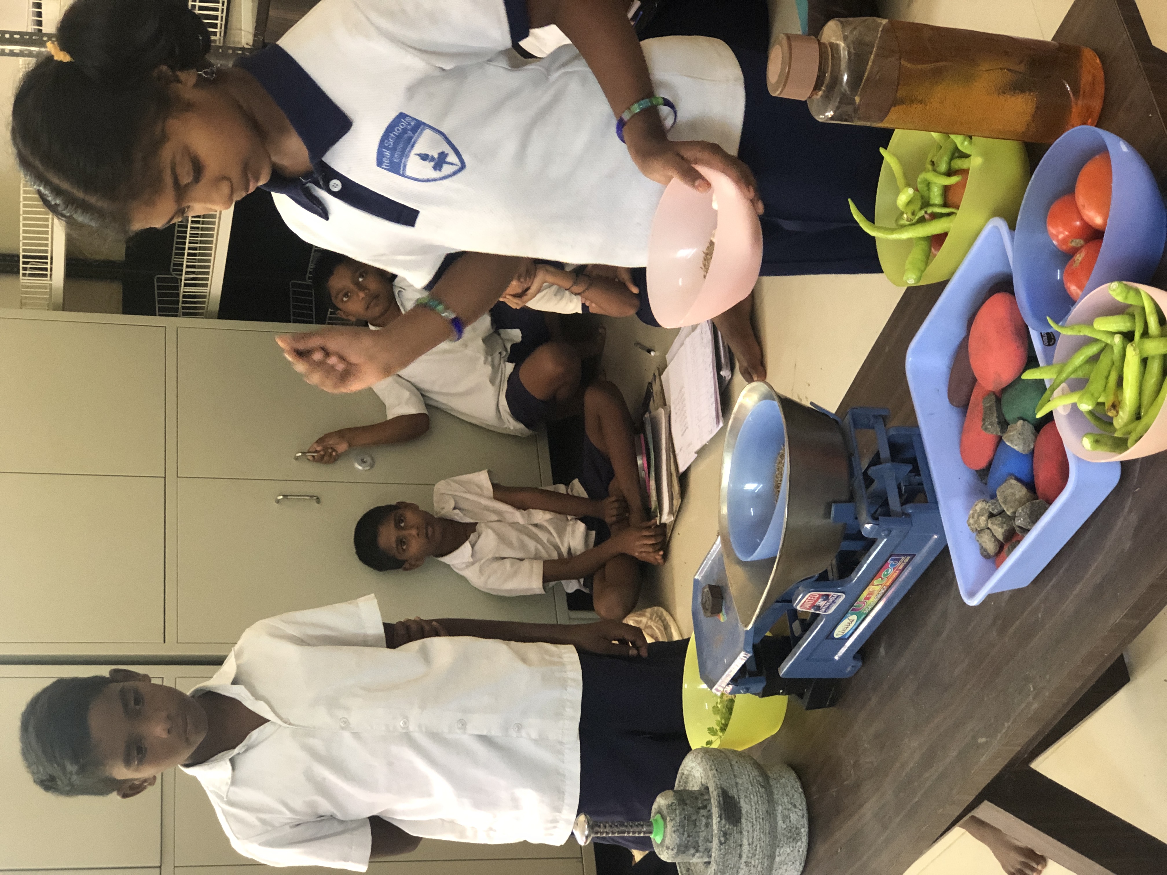 For the chutney to be tasty, everything used to make it should be in the right proportion. Fixed weights and measures of the ingredients is adopted. Thus the students gain practical knowledge of the chapter ’weights and measures’ in mathematics. They make a record of the things used, their weight or measurement and the elaborate making procedure. This, of course, helps the students come to grips with their writing skills as well.